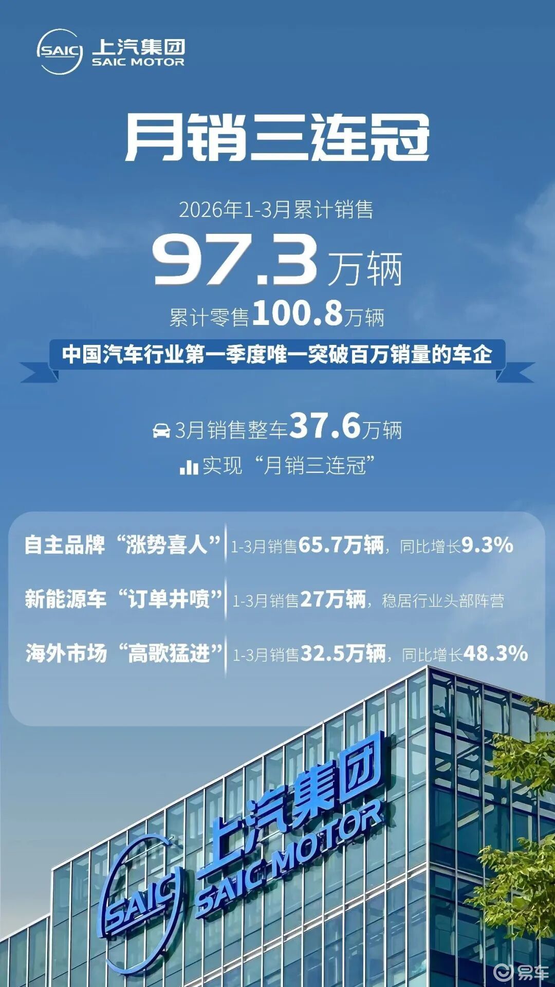 今年3月,上汽集团整车销售37.6万辆,实现“月销三连冠”;1-3月累计批售97.3万辆,同比增长3%;零售销量更是突破100.8万辆,成为中国汽车行业第一季度唯一零售销量破百万的车企。