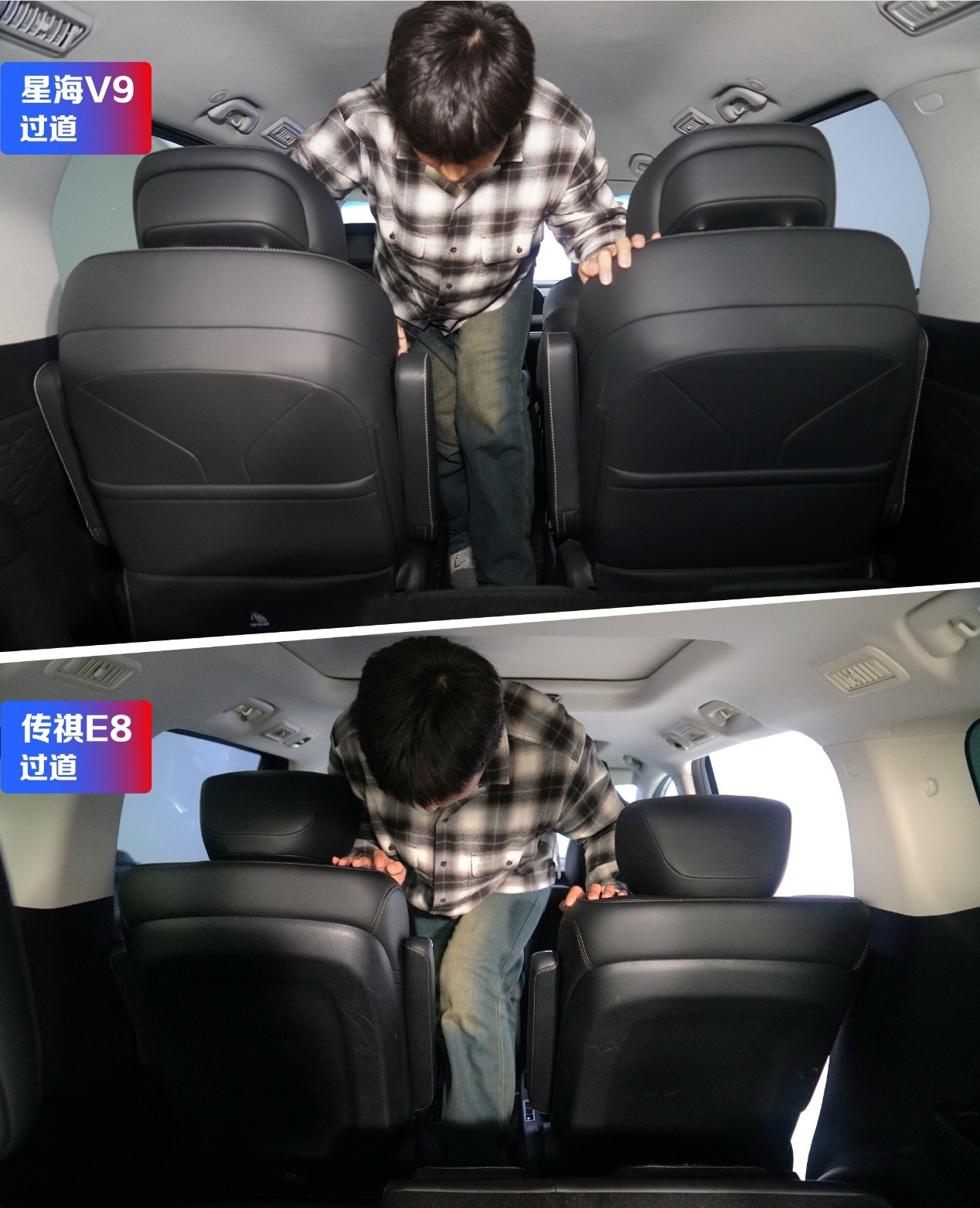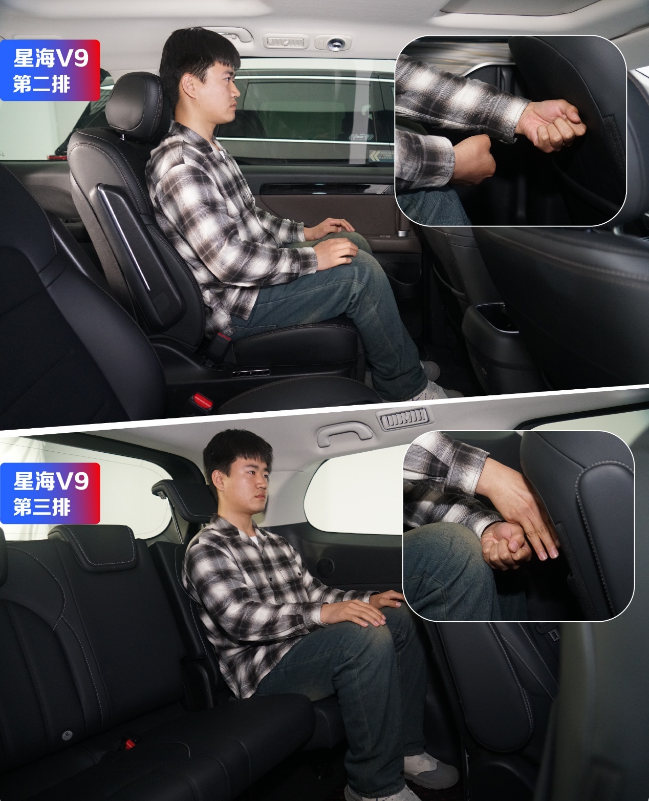 我们让同一个体验者(身高180cm)在两台车的第二排和第三排都坐了坐。在星海V9的第二排,腿部空间大得离谱,就像家里的大客厅;第三排也有不少空间,坐进去不会觉得憋屈。