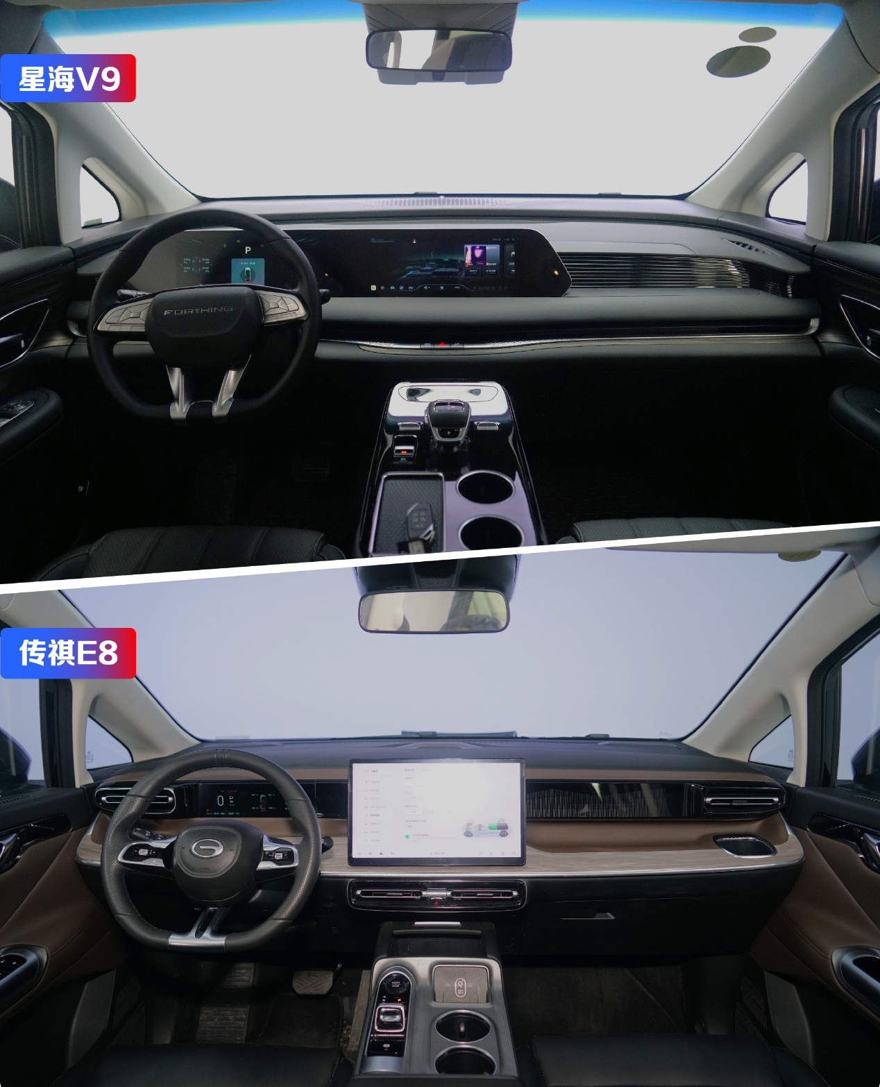 再看看传祺E8,车长将将超过4.9米,轴距也只是刚刚超过2.9米,整体尺寸要比星海V9小很多,只能算是中型MPV。车头分体式灯组加上封闭式中网设计走的是精致科技风,但整体看着还是略显小气了,车内的空间并不大。