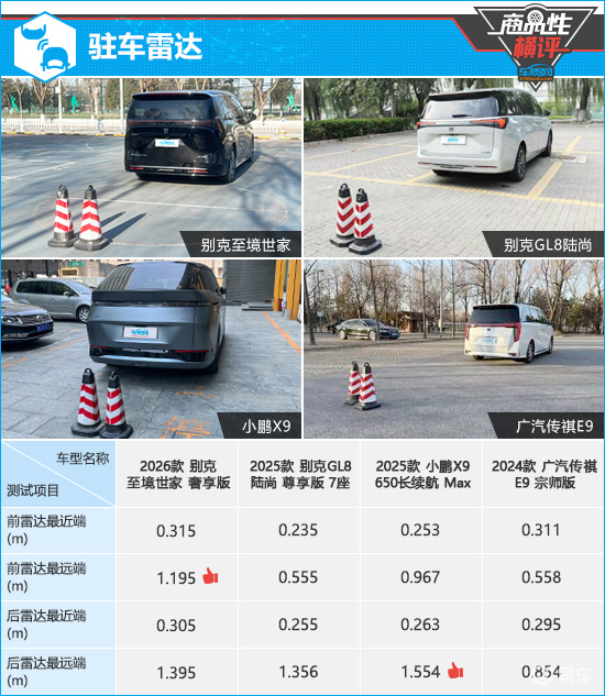 在驻车雷达测试对比环节,根据已有测试数据来看,别克至境世家前雷达探测能力相对较强,最远端数值达到1.195m。小鹏X9后雷达探测能力更强,最远端数值超过1.5m。最近提示距离方面,广汽传祺E9表现相对较好,前后雷达最近端数值与同级别车型测试均值差距较小,而别克GL8陆尚的前后雷达最近端数值与同级别车型测试均值相差较大。