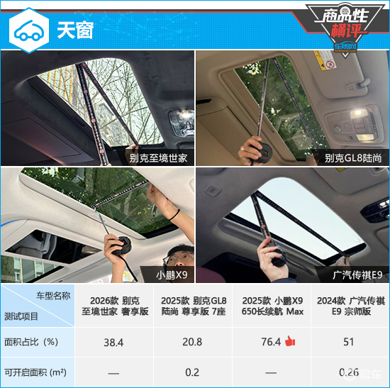 在天窗测试对比环节,别克至境世家和小鹏X9配备分段式不可开启天窗,广汽传祺E9配备分段式电动天窗,别克GL8陆尚则配备普通电动天窗。具体尺寸来看,根据已有测试数据,小鹏X9的天窗面积占比相对较大,采光效果出色。别克GL8陆尚和广汽传祺E9天窗均采用可开启设计,可兼顾采光和透气作用。