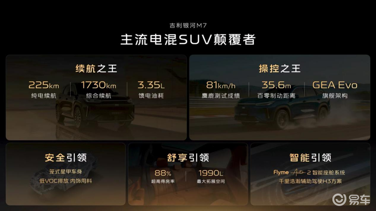 先上干货。银河M7这次打出了三张牌:225km纯电续航、1730km综合续航、81km/h麋鹿测试成绩。