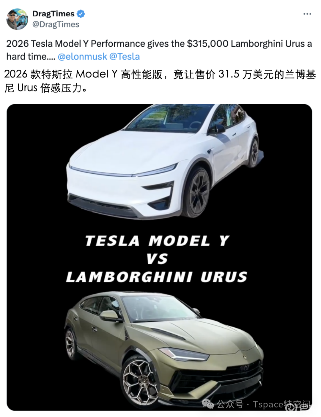 Model Y高性能版直线加速性能超越兰博基尼Urus