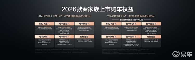上市权益礼:秦L DM-i至高享1.5万元福利,含3000元新车色免费升级,价值3000元TBC系统(云辇型免费送),以及至高5000元金融贴息;秦PLUS DM-i至高1.1万元权益,含置换补贴、金融贴息等。全系享三电系统终身保修(首任车主)、6年/15万公里整车包修,终身免OTA升级等服务,让车主用车无忧