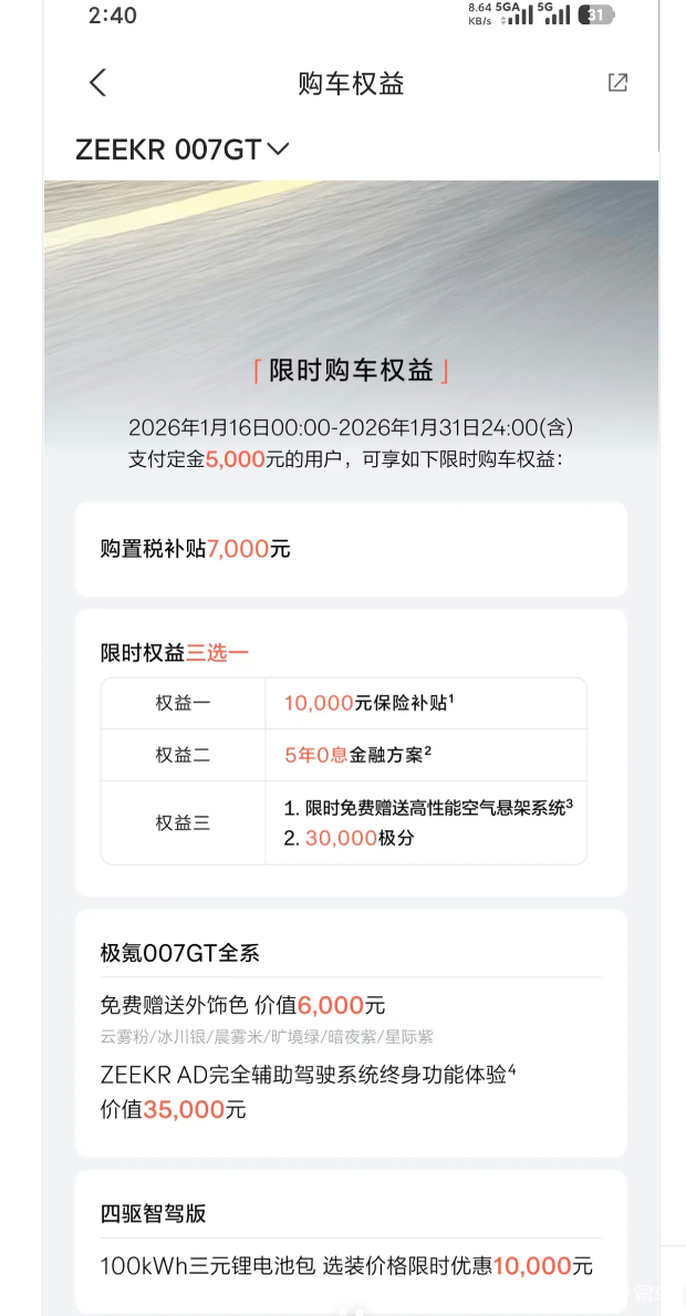 先说说现款007GT最让人心动的“福利组合拳”。对预算有限的用户来说,5年0息方案堪称“减压神器”:首付3.92万起,月供低至2612元,算下来比常规贷款能省2万多利息,相当于用“零成本”把2.95秒破百的猎跑开回家;如果更看重后期用车成本,选1万保险补贴能覆盖大半年度保费;而追求操控的玩家,免费升级的高性能空气悬架绝对是“捡漏”——要知道同级别车型选装空气悬架至少得加2-3万,极氪直接白送,配合前双叉臂+后多连杆悬架,过弯支撑性与滤震舒适性直接拉满,日常通勤或周末跑山都能hold住。